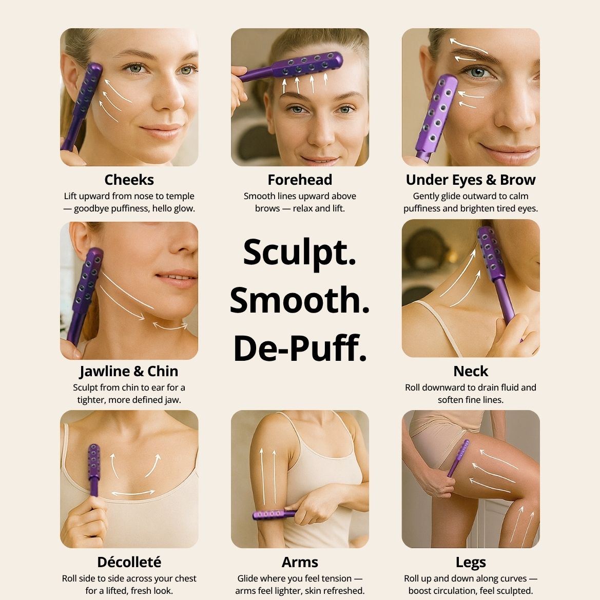 Use gentle back-and-forth strokes over desired areas to relieve tension and refresh skin.